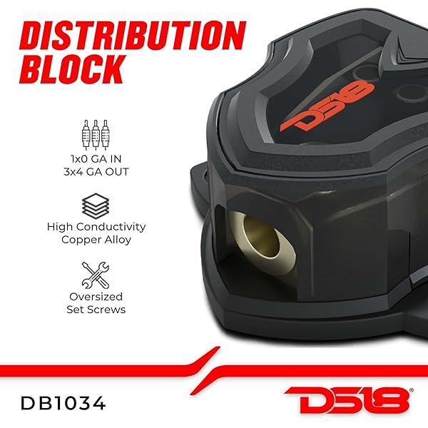 - DS18 DB1034 Distribution Block 1X0-GA in 3X4-GA Out for Car Amplifiers offers reliable performance and quality- High-Quality Connectivity - DS18's DB1034 Distribution Block provides the best value in the industry with top-notch quality, connectivity, and power. It's designed to meet the needs of serious customers who seek reliable and efficient audio solutions