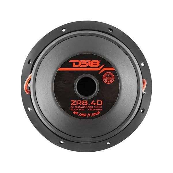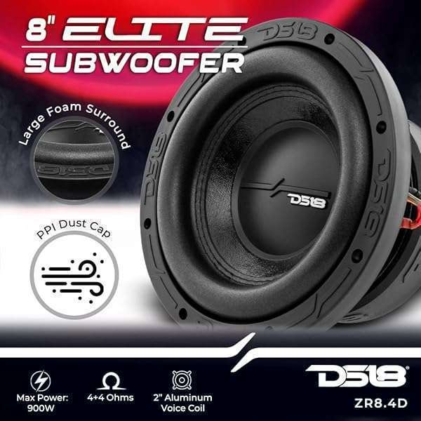 - DS18 ZR8.4D Elite-Z 8 Inch Car Audio Subwoofer 900 Watts Dual Voice Coil 4-Ohm DVC 4+4 Ohm (1 Speaker) provides reliable performance and quality- Large foam surround giving great xmax and bass precision while keeping great cone control when the subwoofer is close to maximum power.- Great power handling of 450w RMS and 900w max through a high strength 2 inch aluminum voice coil.
