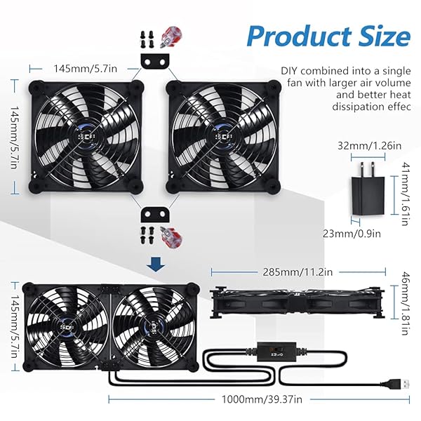 * SCCCF Dual 140mm USB Speed Control Fan, 5V Portable Cooling Fan for Flat-Screen TV Receiver Router DVR PlayStation Xbox Computer Cabinet Cooler: 2 fans can be connected together with metal buckles to provide greater air volume * Can be used as a laptop cooling fan * Dual 14cm USB fans is very suitable for AV receiver/cabinet/game console/PC/laptop/TV box/DVR/router to dissipate heat * The double ball bearing has a service life of 65,000 hours * And the 7 blades produce strong airflow to keep