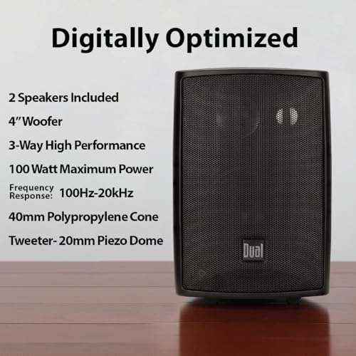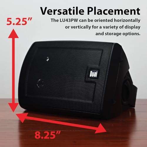 - Dual Electronics LU43PB 4" 3-Way High Performance Outdoor Indoor Wired Speakers | Effortless Set Up | Home, Pool, Patio, Garage Use | Weather Resistant | Expansive Stereo Sound Coverage | Black pro...- DESIGNED TO LIVE INDOORS & OUTDOORS - These studio quality speakers can be mounted/placed in any open space: by the pool, under your patio, in the garage, on a bookshelf; regardless of placement th...