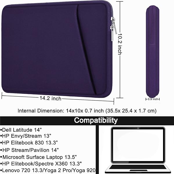 - Laptop Sleeve 14 inch, Durable Carrying Bag Shockproof Protective Case Cover, Handbags Briefcase Laptop Bag Compatible with 14" MacBook Air/Pro HP Asus Lenovo Notebook Computer, Purple offers reliable performance and quality- External Dimensions: 14.2 x 10.2 x 0.9 inches, internal dimensions: 14 x 10 x 0.7 inches, Compatible with most 14" laptop computers.Slim, lightweight and portable to take alone, perfect for traveler, office men and business men