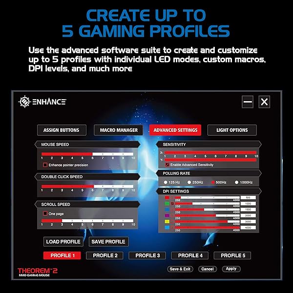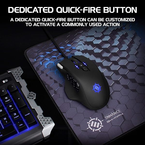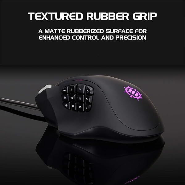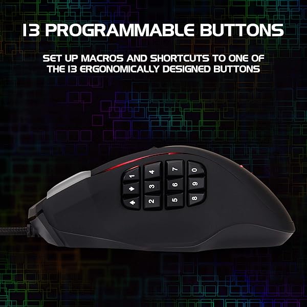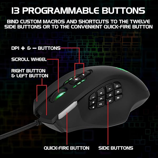 * ENHANCE Theorem 2 MMO Mouse with 13 Programmable Side Buttons - RGB Gaming Mouse with 6 Customizable DPI Settings, 5 Gaming Profiles, Quick Fire Button, Wired, Ergonomic - Black: programmable side buttons: link your keyboard keys * Custom macros * And shortcuts to one of 13 programmable buttons ergonomically designed for ease of use during gameplay * DEDICATED QUICK FIRE BUTTON: Bind a frequently used command to the tactile easy to reach button designed for fast paced strategic gameplay that