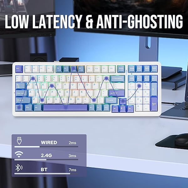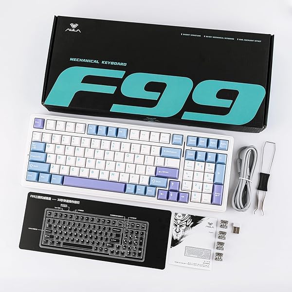 - EPOMAKER x Aula F99 Wireless Mechanical Keyboard, Hot Swappable Gasket Custom Gaming Keyboard with Five-Layer Padding, BT/2.4GHz/USB-C, 8000mAh Battery (White Light Blue, Graywood V3 Switch) with reliable performance and quality- 96% Layout&Gasket Mounted StructureA 96% layout keyboard with 99 keys can help you save more space on your desk, while keeping the arrow keys and number pad you need for games and work. The F99 gaming keyboard gasket-mounted design, complemented by an ext