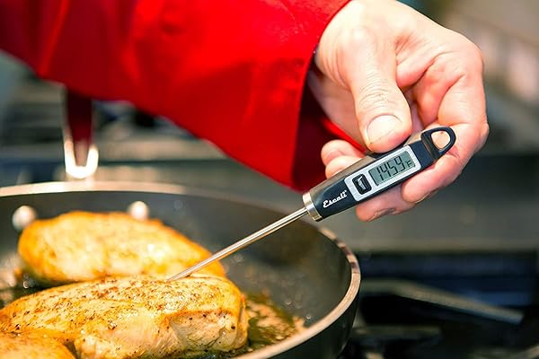 - Escali DH1 Gourmet Digital Meat Thermometer with Extra Long Probe, NSF Certified, Black offers reliable performance and quality- PREMIUM RESULTS: The Escali Gourmet Digital Kitchen Thermometer takes the guesswork out of cooking by measuring internal temperatures of foods like meat or baked goods for better results and greater consistency; Stylish and ergonomically designed with an extra-long probe for extended reach and a comfort grip handle ensure for prolonged use