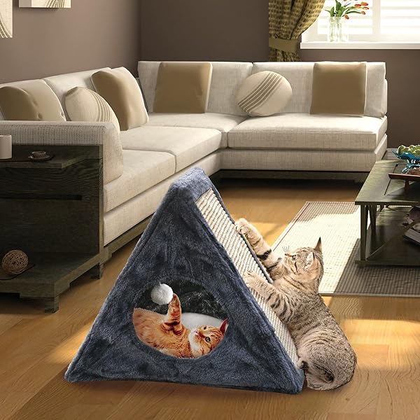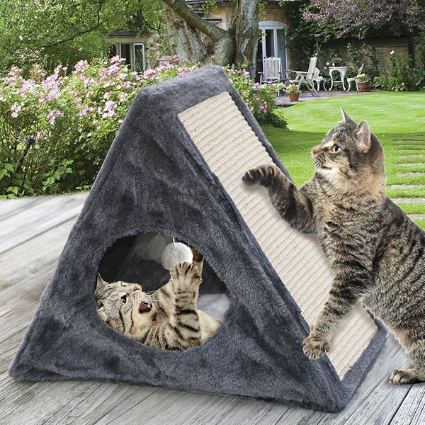 * Etna Products Indoor/Outdoor Foldable Cat Condo - Collapsible Plush Built-in Scratch Pad & Toy: your kitty will be right at home in this attractive * Pyramid-shaped fold-away cat condo! This plush pet furnishing features super-soft gray material on all sides * And a fleecy floor on the inside that removes for easy cleaning * The built-in natural scratch pad durably stands up to feline claws and helps protect your furniture * A puffy white ball hangs from the interior ceiling to provide hours