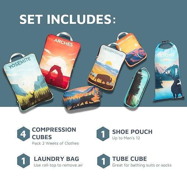 * Large Compression Packing Cubes for Travel-Packing Cube Luggage Organizers 7 Piece Set for Checked Luggage-Ultralight, Expandable/Compression Bags by TRIPPED Travel Gear (National Parks): packing cubes make travel easier * Compression cubes help you with packaging your clothes for upcoming trips by compressing the air out of them * Make your suitcase up to 30% more spacious! * LUGGAGE ORGANIZER * Keep different outfits in separate compression cubes and always be ready for whats next! Easily