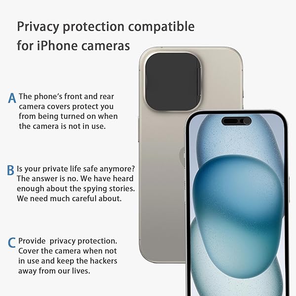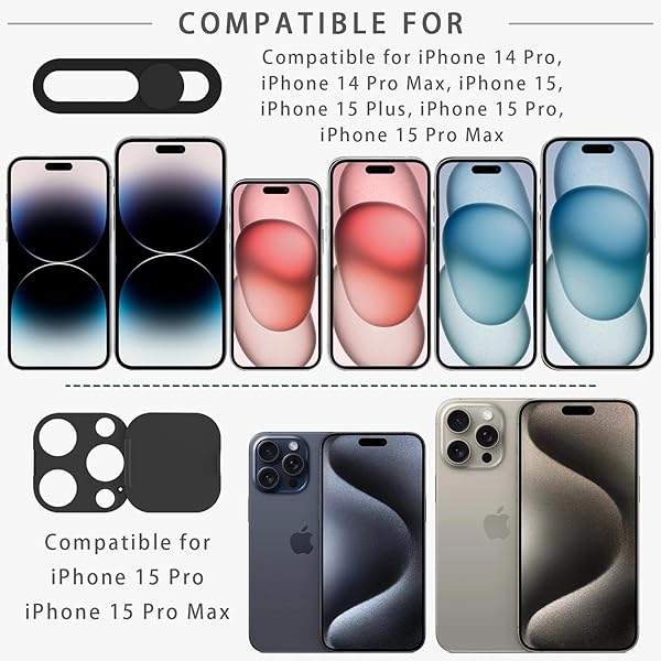 - EYSOFT Privacy Cover Compatible for 15 Pro/iPhone 15 Pro Max with Front Camera Cover,Protect Privacy and Security But Not Affect Facial Recognition2Pack with reliable performance and quality- Package contains 2 camera lens cover compatible for 15 Pro /Phone 15 Pro Max and 2 front camera cover compatible for Phone 15 Pro/ Phone 15 Pro Max(Black)- The front webcam cover is compatible for Phone 15 Pro, Phone 15 Pro Max.Does not affect normal photography and video, can prevent