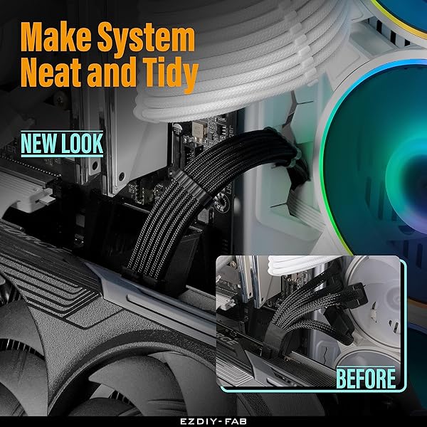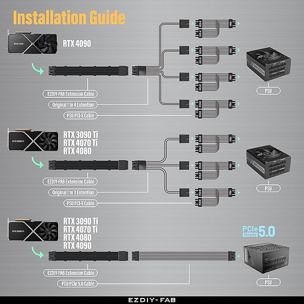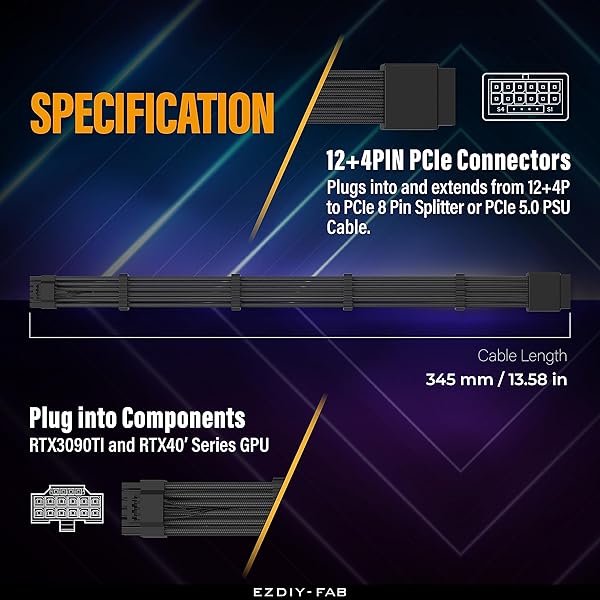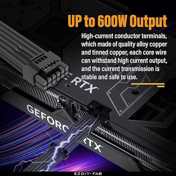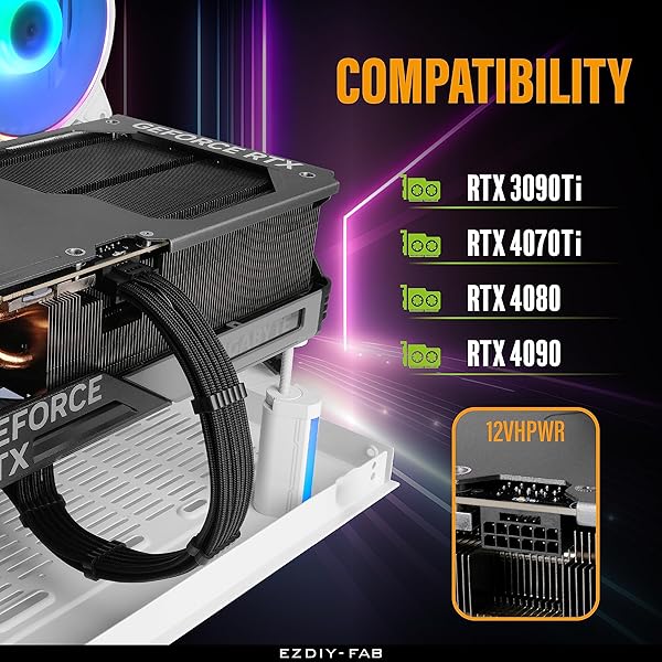 - EZDIY-FAB 16pin (12+4) 12VHPWR PCIe 5.0 GPU Power Sleeved Cable Extension, Male to Female, Compatible with RTX 5080, 5070, 4090, 4080, 4070,16AWG with Cable Combs-Black with reliable performance and quality- Supports RTX 50 series GPUs (except RTX 5090, not recommended). Dedicated design for the specs of 12VHPWR PCIe 5.0 Graphics Cards, compatible with RTX 3090Ti / 4090 / 4080 / other RTX 40 series GPUs. Easily connects using the original 1-to-4 power adapter or PCIe 5.0 PSU power