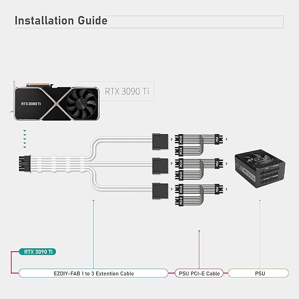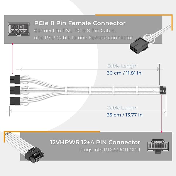 - EZDIY-FAB GPU Power Sleeved Cable Extension, 16pin(12+4) 12VHPWR PCIe 5.0 Connector Male to 3X PCIE 8 PIN for RTX 4070Ti/4080/3090Ti, with Pre-Installed Cable Combs-16AWG/White with reliable performance and quality- Dedicated design for the specs of 12VHPWR PCIe 5.0 Graphics Card, Connect to RTX3090ti GPU without hassle, connecting to PCIe 8 PIN Cable from PSU to get a stable and reliable performance.- This cable is only extension cable. Please do not plug it directly into