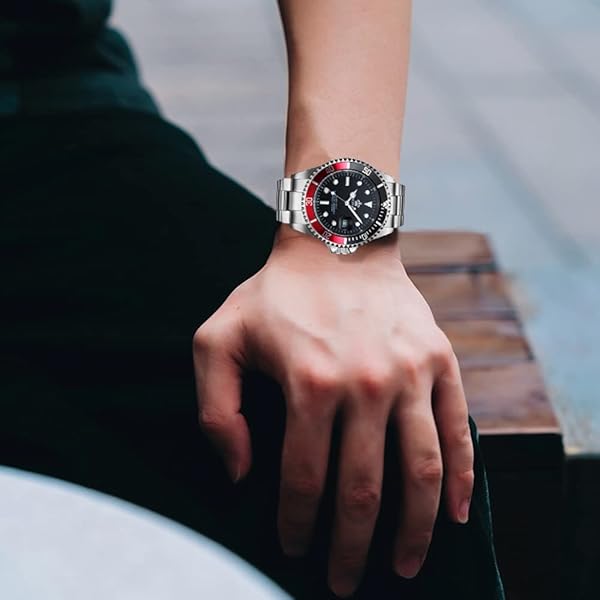 - FANMIS Mens Luxury Watches Rotatable Bezel Sapphire Glass Luminous Hand Quartz Silver Tone Stainless Steel Watch (Black Red) offers reliable performance and quality- Round watch featuring unidirectional green dive bezel with gold-tone trim and logoed dial with luminous hands/markers- Additional features include push-down crown and magnified date window at 3 o'clock