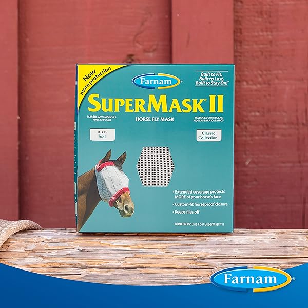 - Farnam SuperMask II Fly Mask Without Ears for Foals, Full Face Coverage and Eye Protection from Insect Pests, Structured Classic Styling Mesh with Plush Trim, Foal Size provides reliable performanc...- INNOVATIVE DESIGN extends over horses face to provide extended coverage against insects and glaring sunlight- PROTECT & SHIELD flies and gnats from landing on your horses face and eyes with this super protective horse fly mask