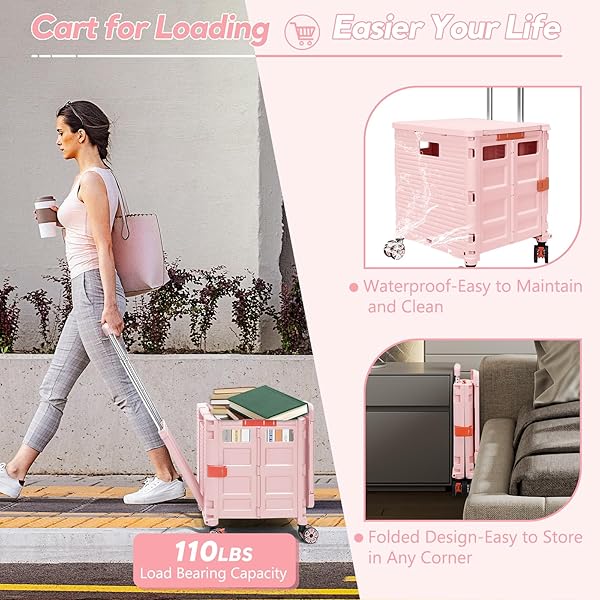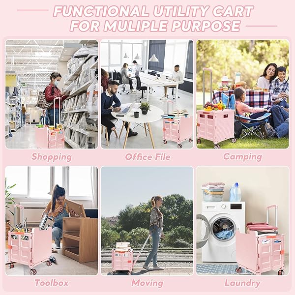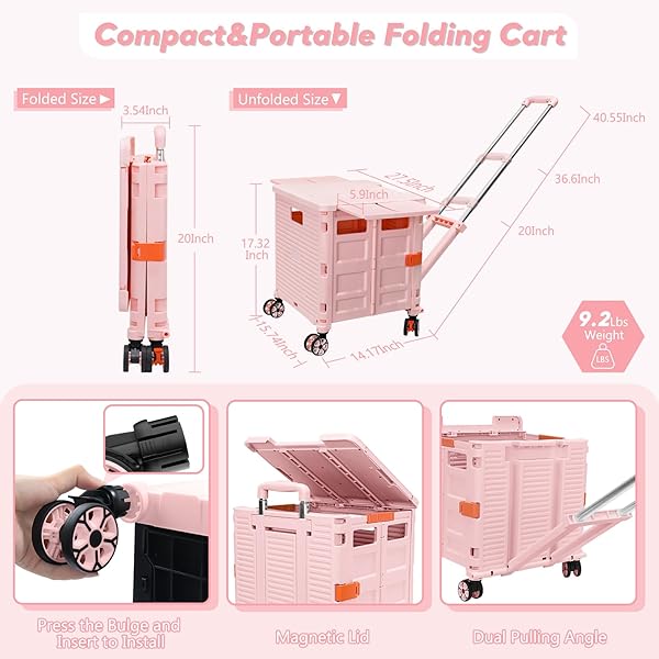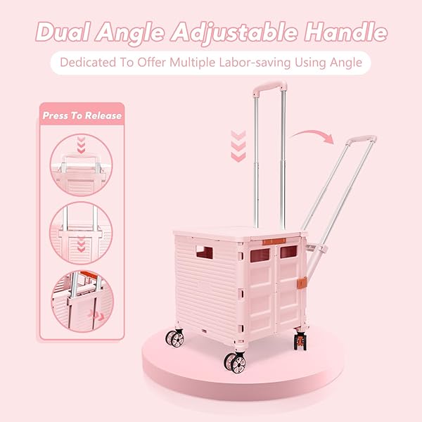 - FELICON SELORSS Folding Utility Cart Rolling Crate Tote Basket Box Storage Handcart on 4 Swivel Wheels with Adjustable Handle Extended Magnetic Lid for Teacher Move Shop Travel Grocery Office(Pink) with reliable performance and quality- Multiple Using Angle with Adjustable HeightThe handle of this collapsible rolling crate is designed to offer vertical or tilted using angle by fixing or unfixing it to the box, you only need to control the handle to adjust the using angle, save mor