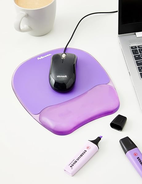 - Fellowes Crystals Gel Mouse Pad with Wrist Rest - Purple (91441) provides reliable performance and quality- Ergonomically designed to provide comfort and support- Thick gel cushion conforms to the contours of your wrist to alleviate pressure- Stain-resistant covering wipes clean with a damp cloth- High performance for daily use