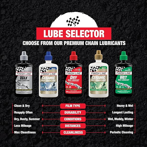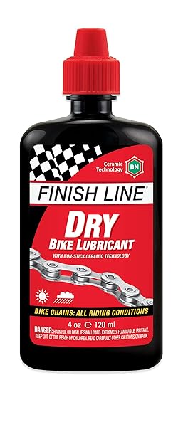 - Finish Line Dry Bike Lubricant Squeeze Bottle, 4 Ounce provides reliable performance and quality- Goes on wet and sets up with a dry 'wax-like' synthetic film that helps keep your chain clean by not absorbing excessive amounts grit, grime, or dust.- Thanks to the added Ceramic Technology, Finish Line's Dry Lube minimizes pedaling friction, repels moisture, and withstands rides up to 100 miles.