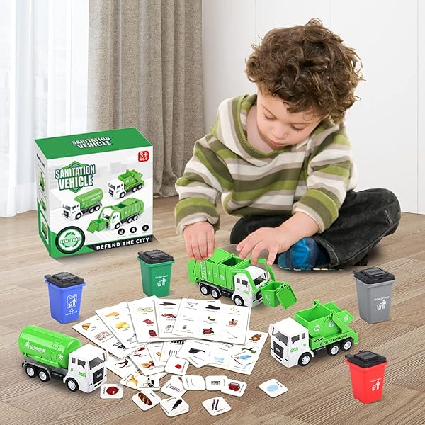 - FIVEDAOGANG Garbage Truck Toy, 3 Pack Friction Powered Waste Management Garbage Truck Game with Front Load Dumpster, Back Dump Garbage,4 Trash Bins with 108 pcs Trash Cards, Gift for 3+ Years Old Kids offers reliable performance and quality