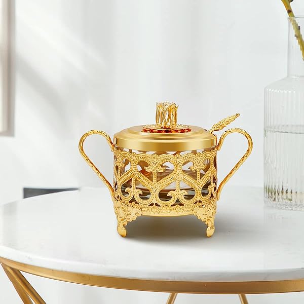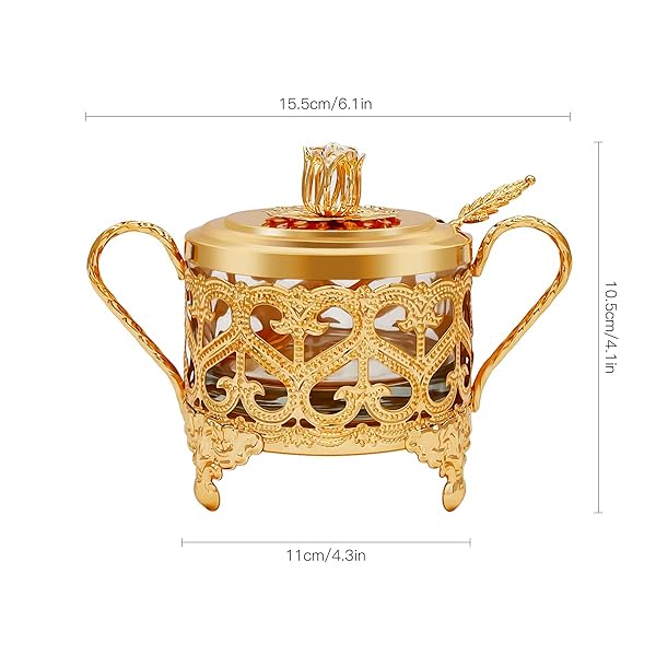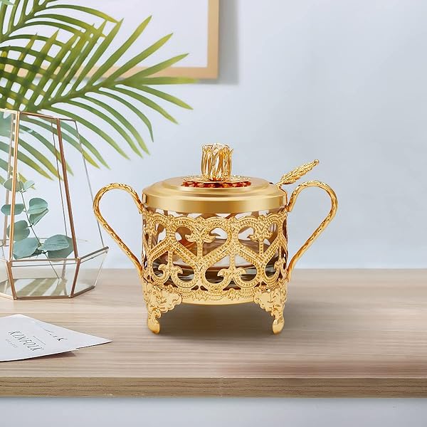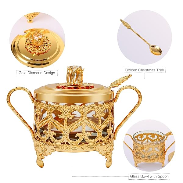 * Flylin Sugar Bowl, Turkish Sugar Bowl Sugar with Sugar Spoon and Lid Dual Holder Bowl Condiment Pot Spice Glass Jar Coffee Bar Accessories Sugar Container for Home and Kitchen: high-quality: sugar bowl with lid and spoon are made of high-quality metal material and clear glass * Sturdy and durable * Corrosion-resistant and not easy to rust * Clear Glass Bowl: The salt server has transparent bowl that can see-through the seasonings easily * And control the remaining capacity at any time for