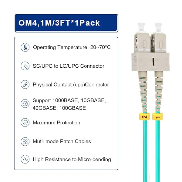 - FLYPROFiber- 1M SC to LC OM4 Fiber Patch Cable | Length Options: 1m-50m, 40GB/100GB Duplex 50/125um Multimode Fiber Optic Cables LSZH-1M (3ft): reliable performance and quality- 1M(3ft) OM4 SC-LC Fiber Optic Patch Cable Multimode 40/100Gb is- Maximum Transmission Distance - 1Gb Ethernet Distance of 550Meters at- 7.5mm Minimum Bend Radius - High Rated 50/125um Fiber and Cladding,- Construction Design - LSZH environmentally friendly Jacket;