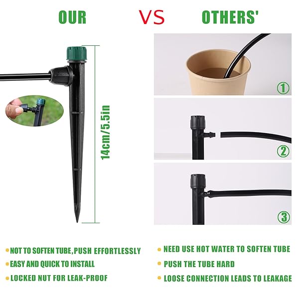 - FOGWOWO Drip Irrigation Emitters for 1/4" Drip Tubing,Adjustable 360 Degree Automatic Irrigation Drippers on 5.5" Arrow Stake,with1/4 Locked Tee for Watering System(10Pcs Drippers and 10Pcs Tee) with reliable performance and quality- Package and Material 10Pcs drip irrigation drippers and 10pcs locked tee.Made of hard plastic parts.anti-pressure,anti-aging and anti-ultraviolet.Attention please:1/4 inch tubing in the image is NOT INCLUDED. It is just an effect display. Please prepa