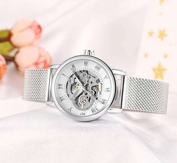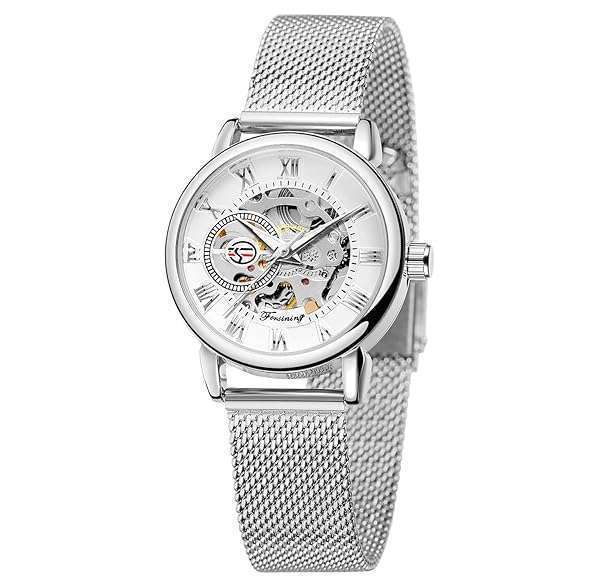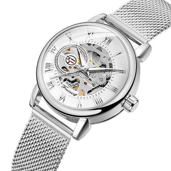 - FORSINING New Women Fashion Skeleton Wristwatch Lady Casual Waterproof Self-Wind Mechanical Watch with Stainless Steel Mesh Band (04-Silver White) provides reliable performance and quality- Unique skeleton design,exquisite stream carving,with metal Roman indexes. A collision of modern and classicality,creating a different transparent mechanical beauty.- ACCURATE TIME KEEPING:High quality mechanical movement with analog display, provide precise time keeping.