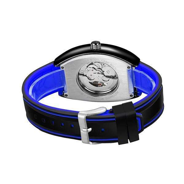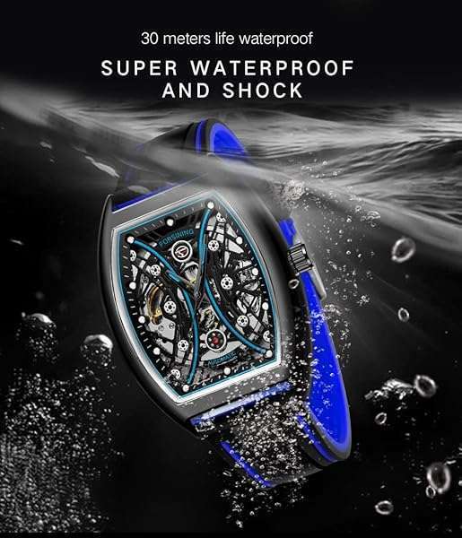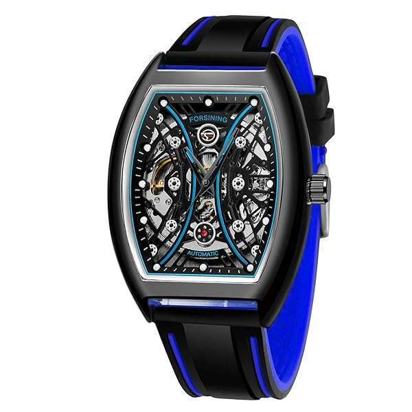 - FORSINING Men's Automatic Skeleton Tonneau Waterproof Sports Watch Silicon Band Mechanical Watch for Men (Blue2): reliable performance and quality- High quality automatic movement provide precise time keeping,no need- Stainless steel case & scratch proof Mineral glass for dial- Water resistant to 30 m Waterproof for daily care ,not for swimming- Suitable for any occasion, sport and outdoor style , whether you are