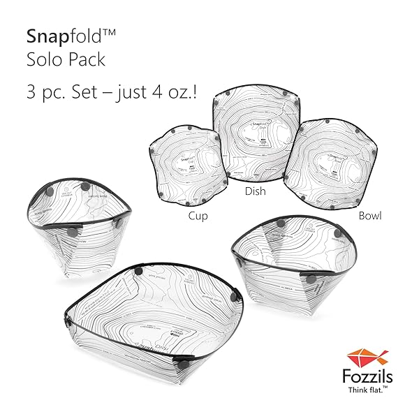 - Fozzils Snapfold Solo Pack (Cup, Bowl, Plate) offers reliable performance and quality- Pack, fold, and store flat- Lightweight, complete set weighs just 4 oz. (113 gm)- Non-stick, easy clean- Handy measuring lines