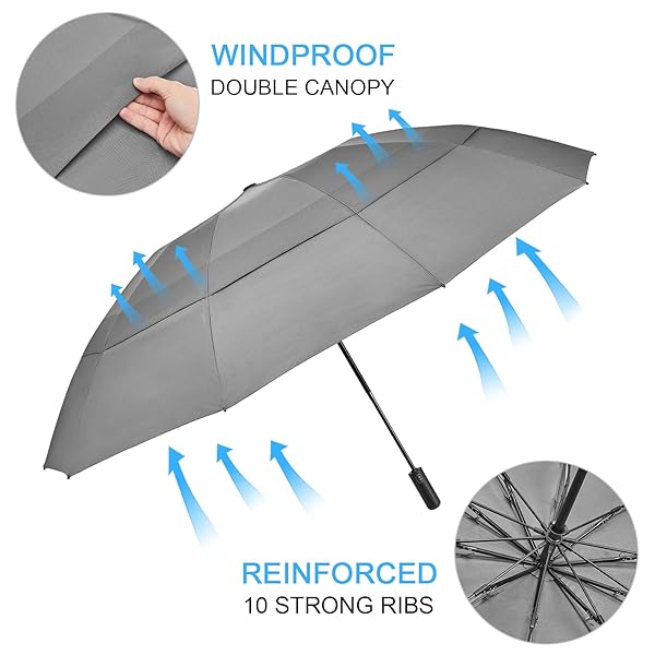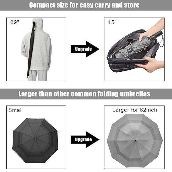 - G4Free 42/46/54/62 Inch Large Golf Umbrella Compact Reverse Travel Umbrella 10 Ribs Windproof for Rain Double Canopy Automatic Open Close with reliable performance and quality- Compact Golf Size Umbrella: This large collapsible umbrella is folded to 15 inches but provides the best coverage for 2 people with a 62-inch arc canopy. Suitable for being packed inside the car, suitcase, or backpack. Larger and stronger than the other travel umbrellas. More compact than ordinary golf umbr