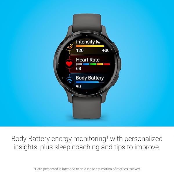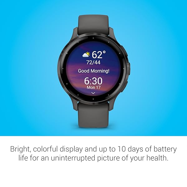 - Garmin Venu 3S Slate Stainless Steel Bezel 1.2-Inch AMOLED Touchscreen Display Smart Watch with 41mm Pebble Gray Case and Silicone Band offers reliable performance and quality- Designed with a bright, colorful display, battery life of up to 10 days in smartwatch mode- BodyBattery energy monitoring helps you understand when youre charged up or need to rest with even more personalized insights based on sleep, naps, stress levels, workouts and more