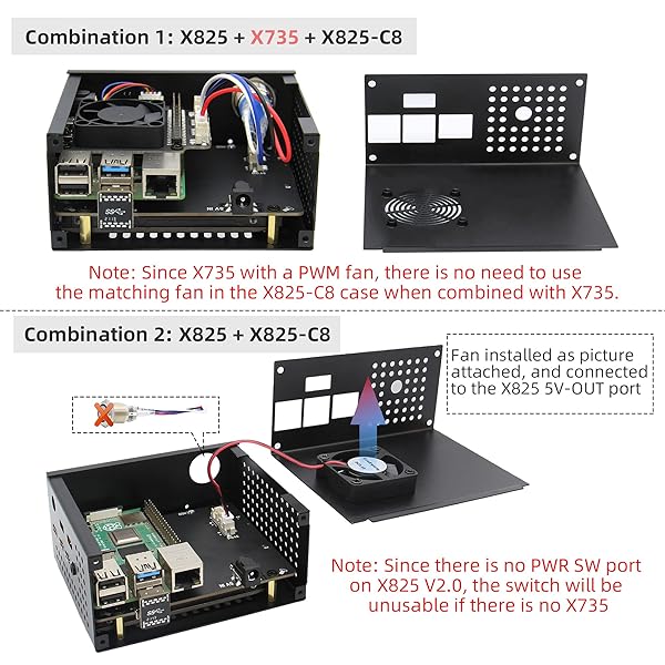 - Geekworm X825-C8 (X825 V2.0) Metal Case+Power Switch+Cooling Fan Support X825 V2.0 2.5 inch SATA SSD/HDD Shield & Raspberry Pi 4 Model B & X735 Only(Not Include RPi4&X825 V2.0&X735&PSU&SSD&TF Card) offers reliable performance and quality- Overview: New X825-C8 metal case with power switch and cooling fan specially designed for X825 V2.0- Compatibility: X825-C8 is only compatible with X825 V2.0 and Raspberry Pi 4 and X735 power management board