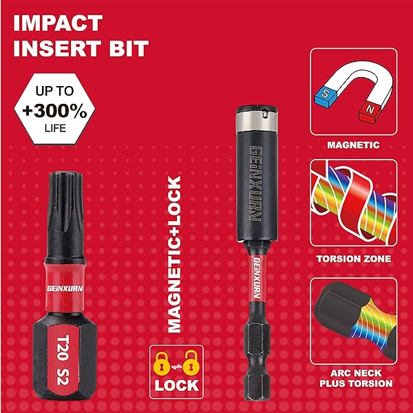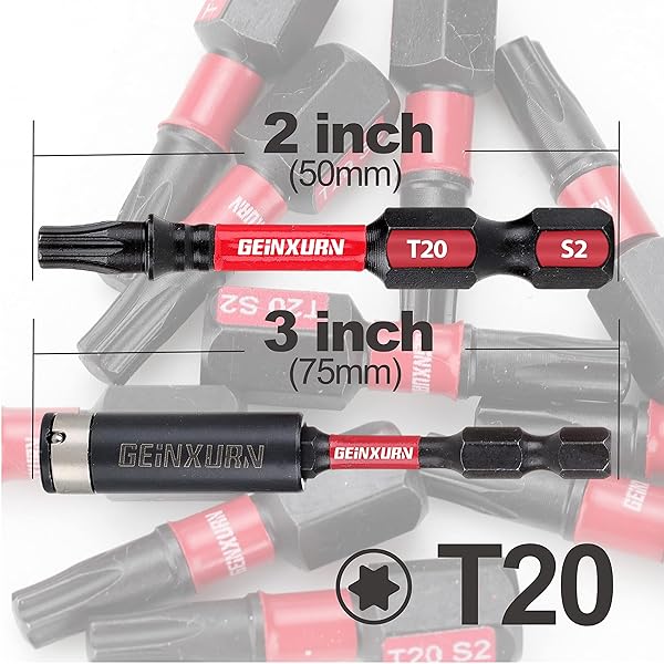 - GEINXURN 50 Pieces T20 2 In. Impact Tough Magnetic #20 Torx Head Power Bits, S2 Alloy Steel T20 Screwdriver Bits Set with 1Pcs Impact Bit Holder offers reliable performance and quality- Impact Screwdriver Bits: 50 Pieces 2 inch #20 Torx Head with 1pieces Magnetic impact bit holder. Impact Shock Absorbent Zone stands up to punishment from high-torque impact driver