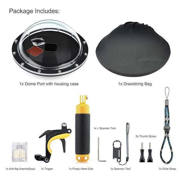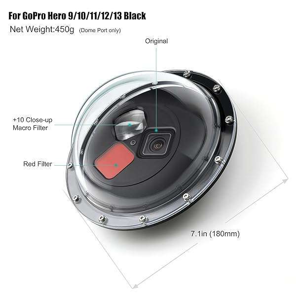 * GEPULY Dome Port for GoPro Hero 13 12 11 10 9 Black, Dome Port Lens with Waterproof Housing Case, Trigger, Floating Hand Grip, Built-in Switchable Red Filter and 10x Macro Filter: this dome port is compatible with gopro hero 13 / hero 12 / hero 11 / hero 10 / hero 9 black * It's up to 147ft waterproof and provides superior optical performance * Move waterline away from the lens makes it possible to capture images both above and below the water simultaneously * The wide angle dome lens helps