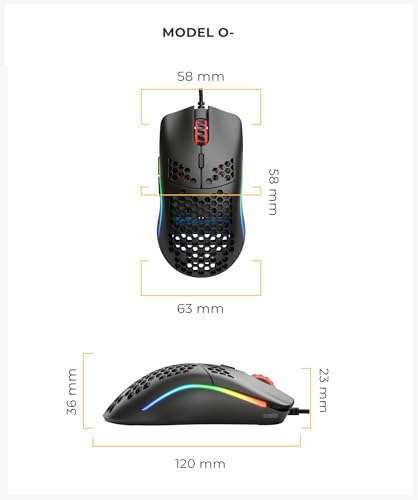 - Glorious Model O- (Minus) Compact Wired Gaming Mouse - 58g Superlight Honeycomb Design, RGB, Pixart 3360 Sensor, Ambidextrous, Omron Switches - Matte Black provides reliable performance and quality- Size & style: Ambidextrous lightweight mouse for gaming. Built for speed, control and comfort, with optimal weight and high durability. The Model O- (Minus) is ideal for Medium and Small hands.