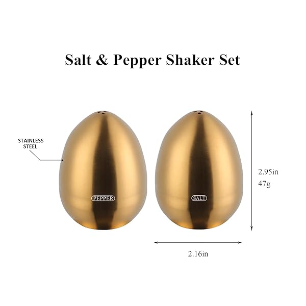- 2-Piece Set Gold Salt Pepper Shakers, Cute Egg Shape Stainless Steel Condiment Jar for Home and Kitchen Utensils, Comfortable and Ergonomic offers reliable performance and quality- Color: Gold- Package: 2x Salt Pepper Shakers. Measures 3" H x 2.2" diameter