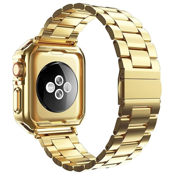 - Compatible with Apple Watch Band and Case, Stainless Steel Metal Chain with TPU Cover, Smart-Watch Link Bracelet Strap, Wrist-Band for i-Watch Series 9 8 7 6 5 4 3 2 1 SE, 45mm 44mm 42mm, Gold prov...- Designed for Apple Watch Metal Band with TPU Case: Compatible with Apple watch 45mm (Series 9/8/7), 44mm (series SE/6/5/4), 42mm (series 3/2/1), suitable for men.