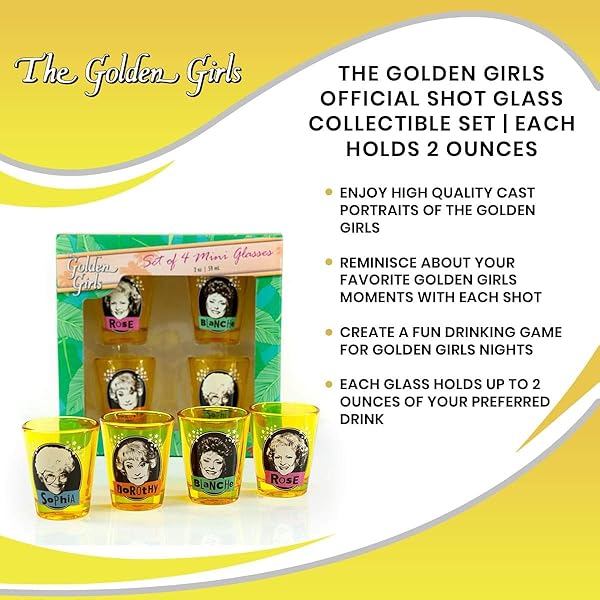 - Golden Girls The Official Shot Glass Collectible Set | Features One Shot Glass For Each Each Holds 2 Ounces offers reliable performance and quality- TURN GIRLS NIGHT INTO A GOLDEN GIRLS NIGHT: Looking for a fun activity during your next girls night? Here's your solution! Settle in for a Golden Girls marathon and create your own drinking game! Assign each person a glass cup and create your own rules!