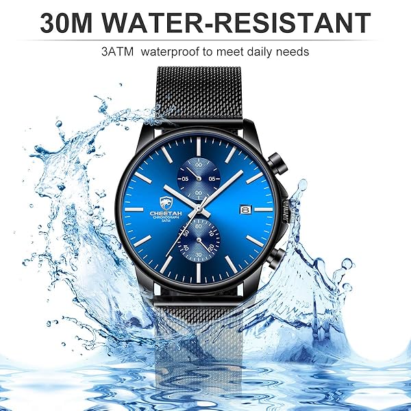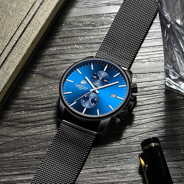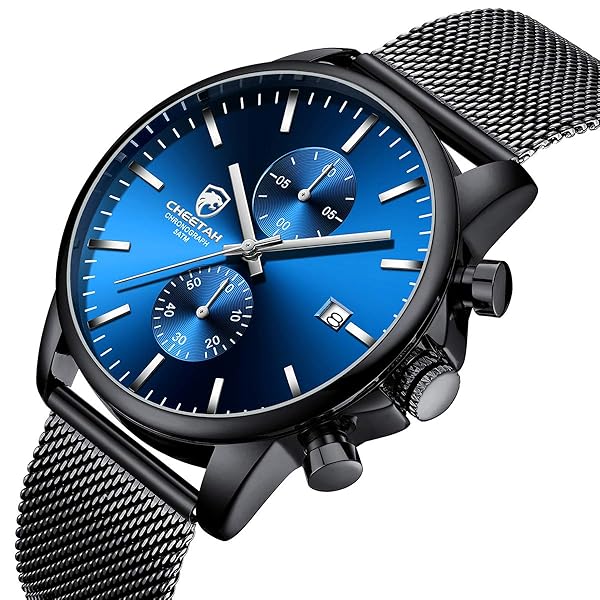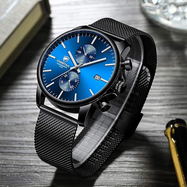 - GOLDEN HOUR Mens Watch Fashion Sport Quartz Analog Mesh Stainless Steel Waterproof Chronograph Watches, Auto Date in Silver Hands, Color: Black Blue Face offers reliable performance and quality- Movement: Japanese imported quartz analog movement and battery, provide precise time and long-term running. The watch can be used for more than 1 years