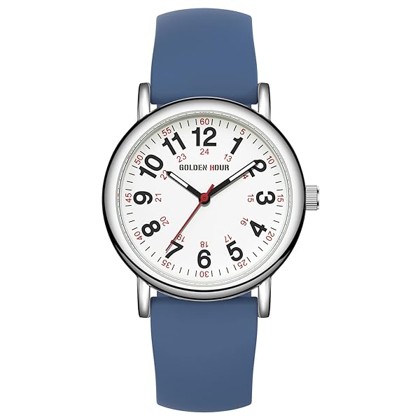 - GOLDEN HOUR Waterproof Nurse Watch, 38mm, 24-hour Luminous Dial, Red Second Hand, Silicone Band, Navy Blue offers reliable performance and quality- SUPER EASY TO READ: white dial with 12 & 24 hour markers and Luminous Face. Japanese quartz movement with highly visible red second hand. Case diameter:38 mm
