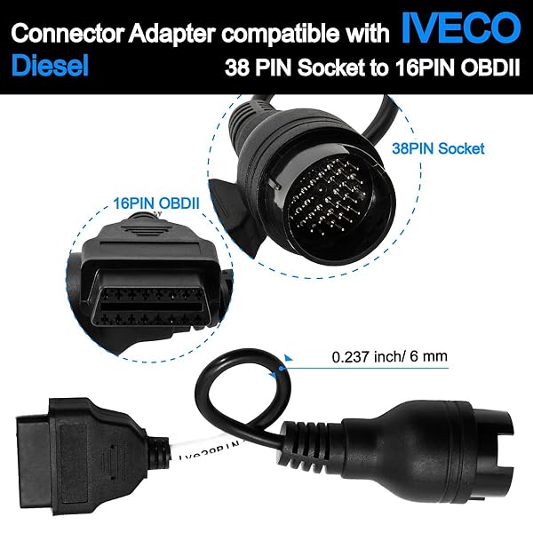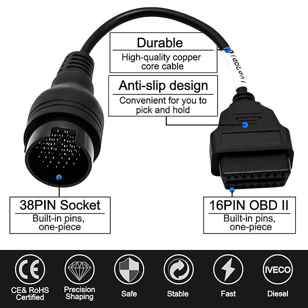- Goliton OBD2 Diagnostic Scan Cable 16 Pin 38 Pin Compatible with Iveco Truck with reliable performance and quality- This cable will allow you to connect compatible TCS diagnostic tools for IVECO vehicles equipped with a 38 pin plug to your existing 16-pin OBD2 instrument.- Before buying, please make sure the product interface shown in the picture is suitable for your car. If the item does not fit your car, it will be nice to contact us to help you.- CONNECTOR: 38 pin