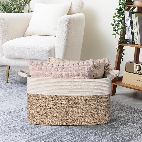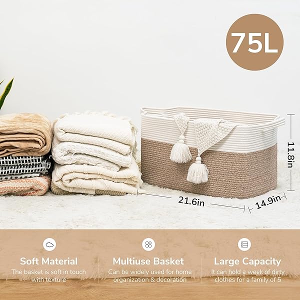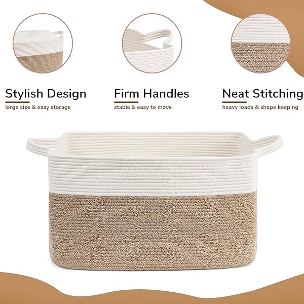 - Goodpick Large Woven Blanket Basket, 21.6" x 14.9" x 11.8" Storage Baskets for Organizing, Rectangle Cotton Rope Toy Basket for Living Room, Bedroom, White & Brown offers reliable performance and quality
