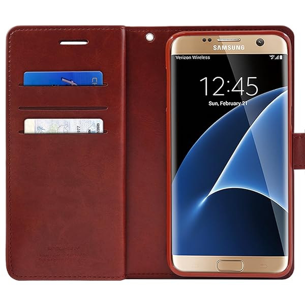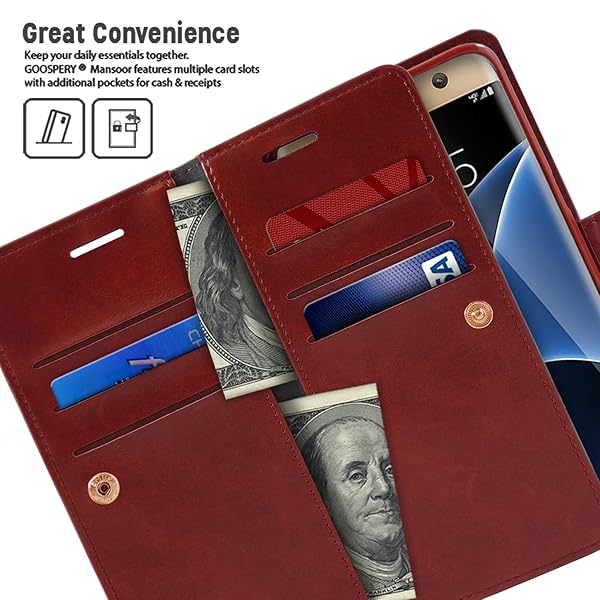 - GOOSPERY Mansoor Wallet for Samsung Galaxy S7 Edge Case (2016) Double Sided Card Holder Flip Cover (Wine) S7E-Man-WNE with reliable performance and quality- Designed with an attached center flap to provide more compartments for credit/ID cards and cash compared to other diary type cases out there, eliminating the need to carry a separate wallet.- A strong, yet easy-to-open snap fastener strap (no magnet) keeps the case securely closed.- Made with Premium Soft Synthet