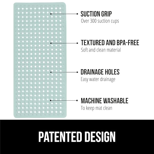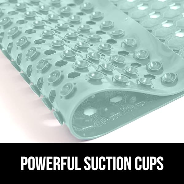 * GORILLA GRIP Patented Bath Tub Shower Mat, Machine Washable Bathtub Floor Liner Mats, Suction Cups and Drain Holes to Keep Tubs Clean, Soft on Feet, Bathroom Essentials, 35x16 Inch, Mint Opaque: patented design with powerful suction grip: a bath mat designed to securely stay in place * This patented bathtub mat features hundreds of suction cups that effectively help secure the tub mat to your shower floor * EASY WATER DRAINAGE: hundreds of drainage holes allow for water to easily flow under