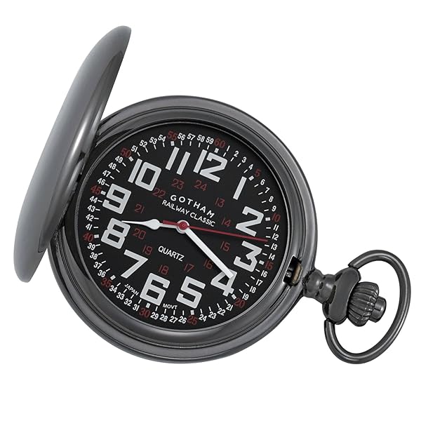 - Gotham Men's Gunmetal Railroad Polished Finish Covered Quartz Pocket Watch # GWC15044BBK offers reliable performance and quality- Elegant highly polished 47 millimeter gunmetal covered hunter case- Black railroad style dial with white Arabic numbers plus 24 hour and 60 second minute track- Precision Japanese analog quartz battery operated movement- Includes matching 14" curb pocket watch chain with belt clip attachment