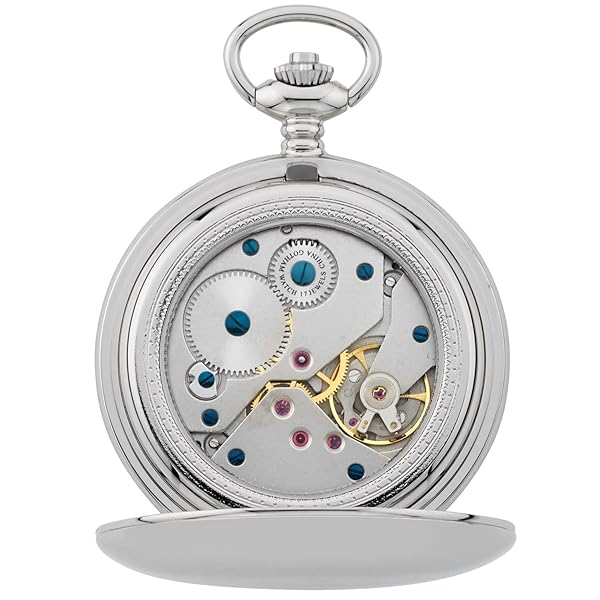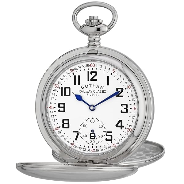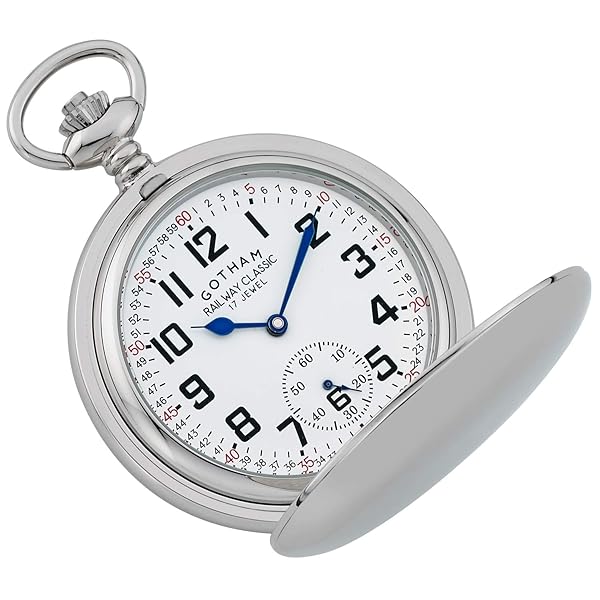 - Gotham Men's Silver-Tone Railroad Dial Double Hunter 17 Jewel Mechanical Pocket Watch # GWC18806S offers reliable performance and quality- Deluxe 54 millimeter(2.13 inch) diameter double hunter chrome plated brass pocket watch suitable for engraving- Precision 17 jewel small seconds hand mechanical hand wind movement- White ceramic railroad style dial with classic blue cobalt hands