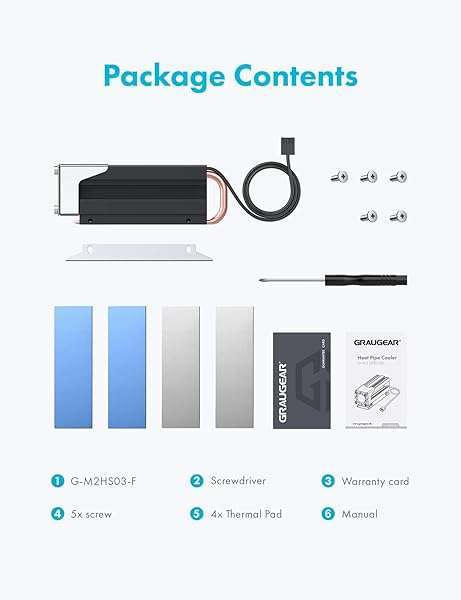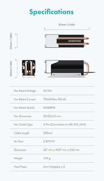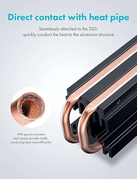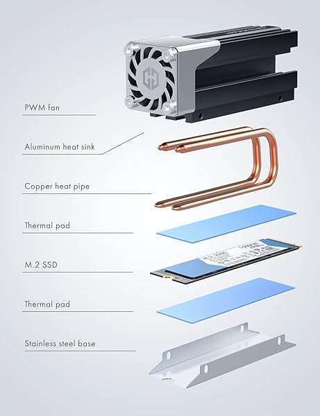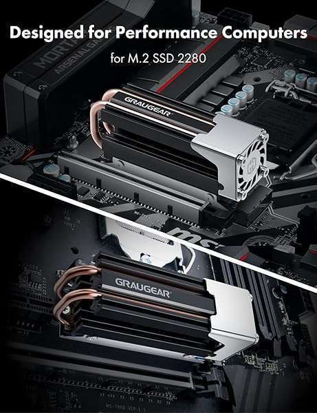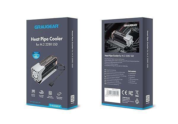 - GRAUGEAR M.2 2280 SSD Heatsink, Direct-Touch Heat of Dual Copper Heat Pipes, 25mm Cooling Fan Built-in PWM Control, Aluminum Plate-Fin Design, Thermal Pads incl., 1.34 in Height [G-M2HS03-F] provid...- Copper Heat PipeDual copper heat pipes provides maximum cooling performance by using DTH(Direct-Touch Heat). Its flat machined surface touches the SSD evenly and conducts heat extremely fast