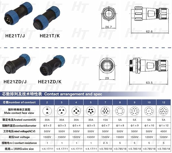 - HangTon HE21 3 Pin Outdoor Waterproof Connector Electrical Circular Threaded Male Cable Plug Female Panel Mount Socket for LED/Power/Lighting Equipment offers reliable performance and quality- Cable Range: 8-12mm, Wire Size: 4.17mm or 11AWG, Contact Diameter: 3mm- Rated Voltage/Current : AC 500V/30A, Resistance: 1m- Protected against solids & liquids, provide a secure and reliable connection in the harsh environment- For indoor and outdoor use