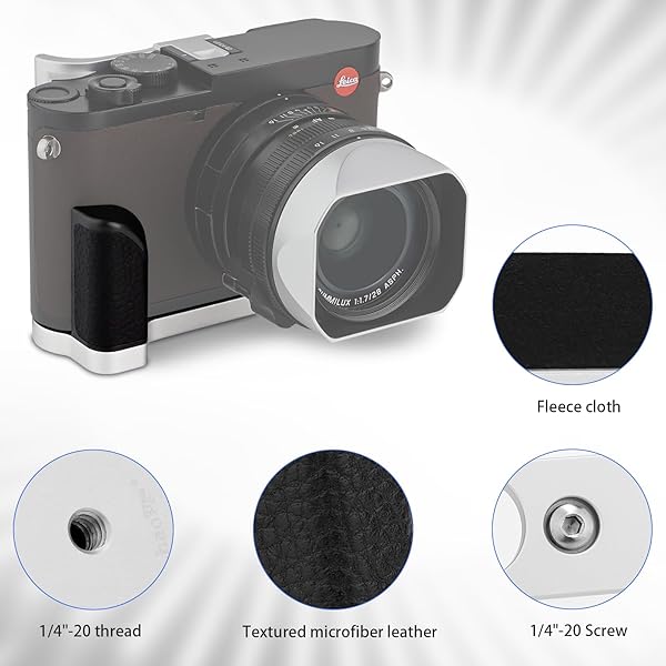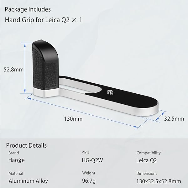 - Haoge HG-Q2W Hand Grip Bracket Holder Designed for Leica Q2 Camera Body offers reliable performance and quality- The Haoge HG-Q2W Hand Grip specifically designed for Leica Q2- It can easily be screwed on the Leica Q2 and enables a better grip, offering a more secure hold for shooting with your Camera- The shape and the textured surface give you more to hold onto, so you can enjoy better handling and a more solid hold