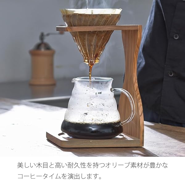 - Hario V60 Olive Wood Pour Over Stand Set offers reliable performance and quality- Practical capacity of 1-4 cups- Includes measuring spoon and 100 paper filters- Borosilicate glass amd olive wood- Made in Japan