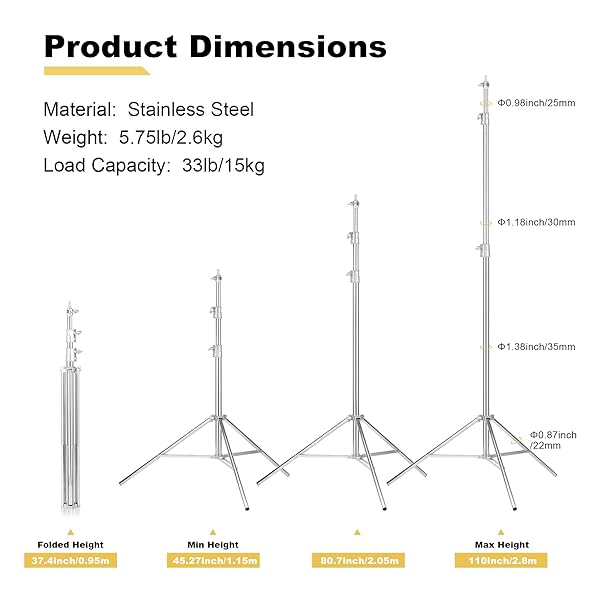 * Heavy Duty Light Stand 9.18ft/2.8m Stainless Steel Light Stand for Head Light, Strobe Light, Softbox, and Other Photography Equipment: durability * Stainless steel material is strong * Corrosion-resistant and long-lasting * Its material ensures that it can be used for a long time without replacement * Adjustable Height