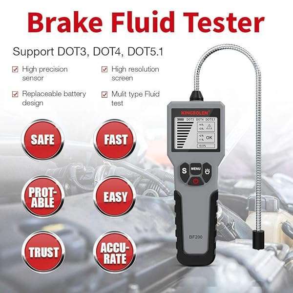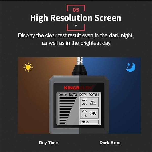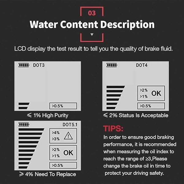 * Brake Fluid Tester, High Precision Car Brake Fluid Detector, Hydraulic Fluid/Liquid/Oil Moisture Analyzer with LCD Screen Audible Alarm DOT3 DOT4 DOT5.1 Tester,Automotive Replacement Level Sensors: [scope of application] * Automotive Brake Fluid Detector is common fit for most vehicle * Check the health status of DOT-3 * DOT-4 * DOT-5.1 brake fluid and also most synthetic brake fluids