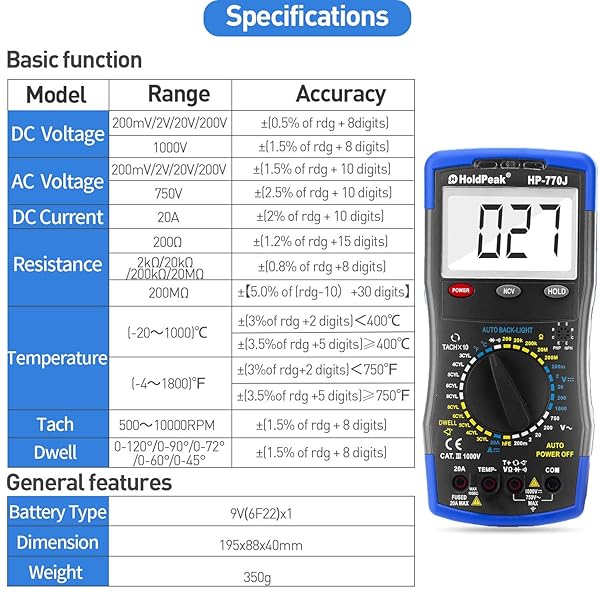 * Digital Multimeter HP-770J Automotive Multimeter Engine Analyser Manual Ranging NCV Multi Tester Voltmeter Measure Voltage+Current+Resistance+Temp+RPM+Dwell Angle with Data Hold+Backlight+Auto Off+/: holdpeak hp-770j digital automotive multimeter manual ranging ncv multimeter for measuring rpm,dwell angle and data hold with voltage current resistance temperature test * Our Commitment AOPUTTRIVER provide y and lifetime user tech-support * AOPUTTRIVER Customer service will reply and solve your