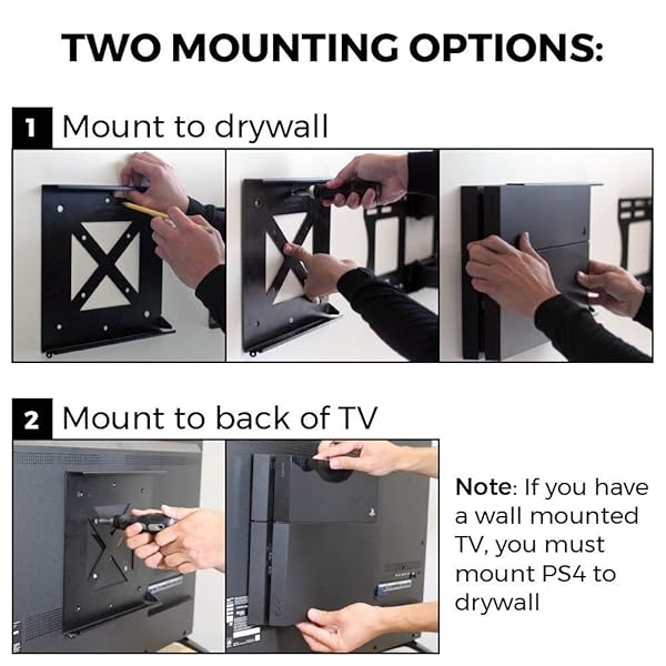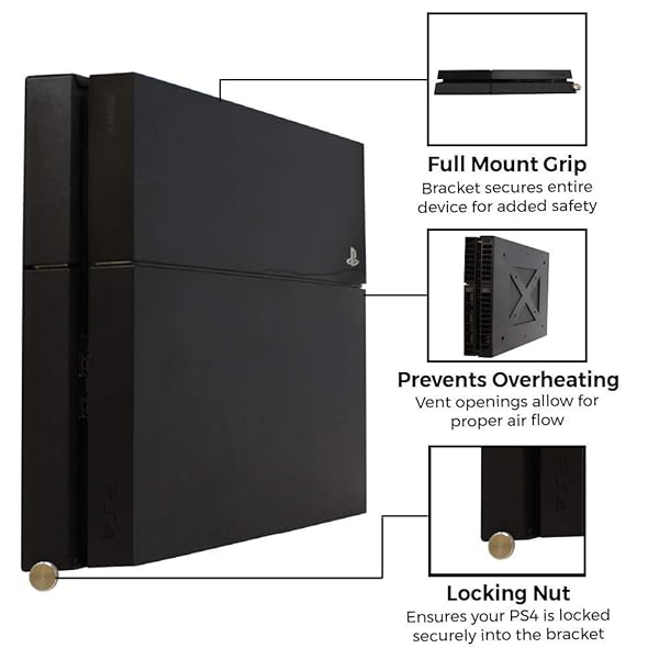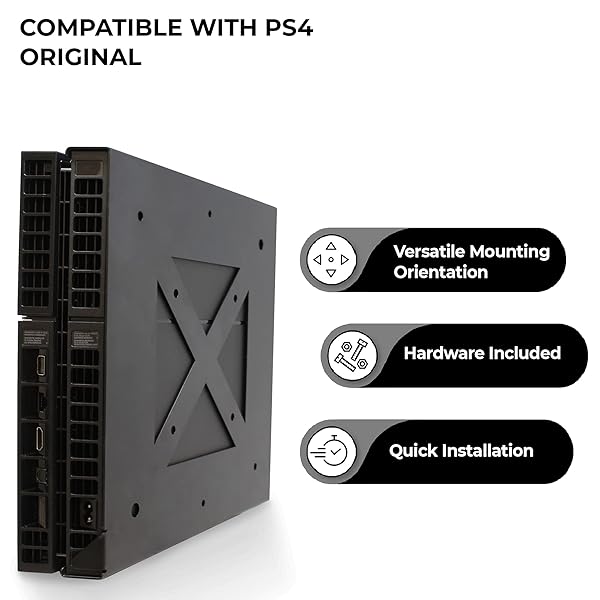 - HumanCentric Wall Mount Compatible with Original PS4 Fat Version, Mount on The Wall or on The Back of The TV with a VESA Pattern, Does Not Work with Slim or Pro PS4, Hardware Included: reliable performance and quality- IMPORTANT NOTE: If you bought your PS4 in 2016 or- CUSTOM PS4 WALL MOUNT KIT: Hide your cables and- MOUNT ON THE WALL OR THE BACK OF THE TV: Mount your- DESIGNED TO PROTECT AND COOL YOUR PS4: The minimalist